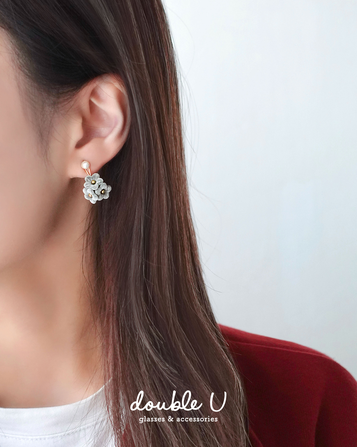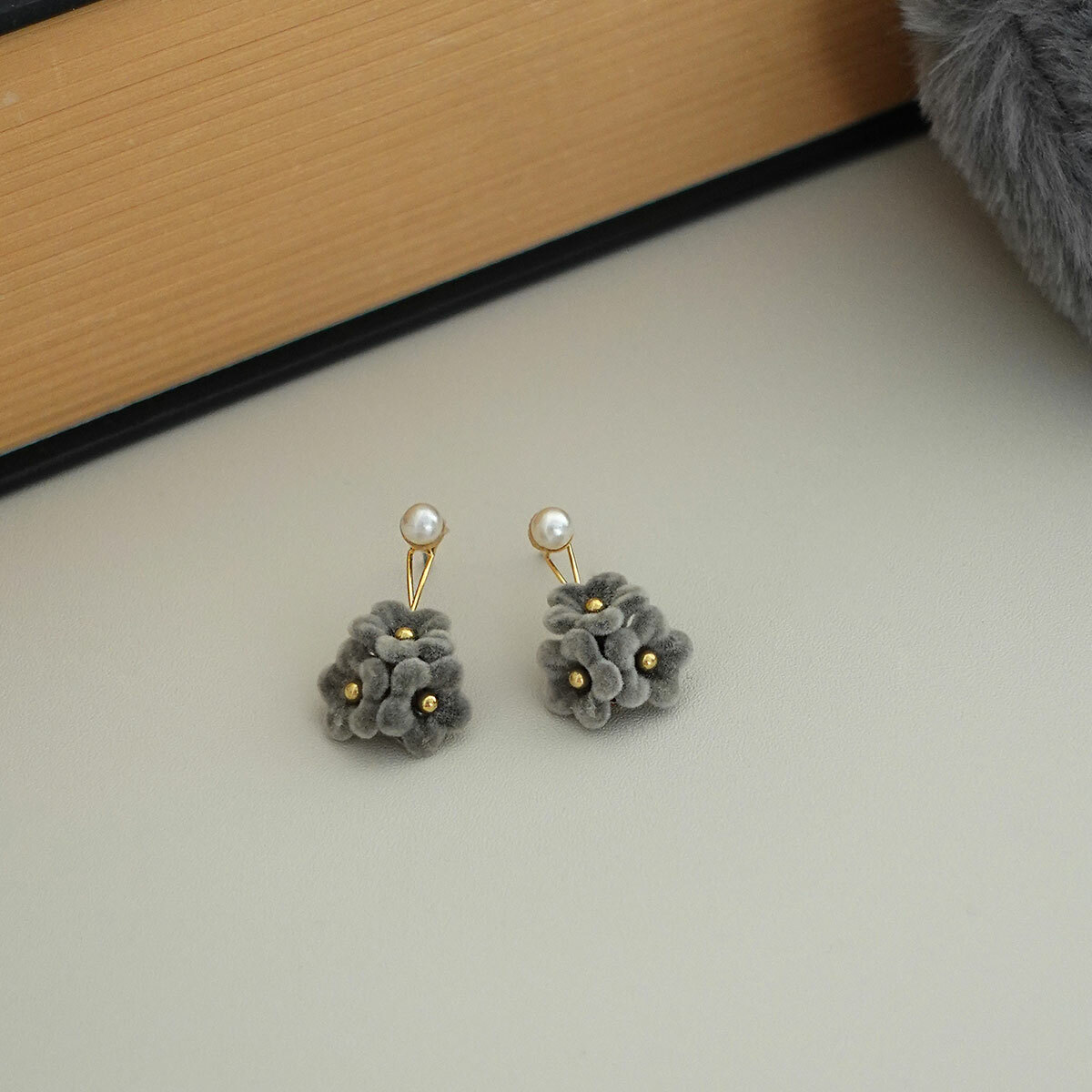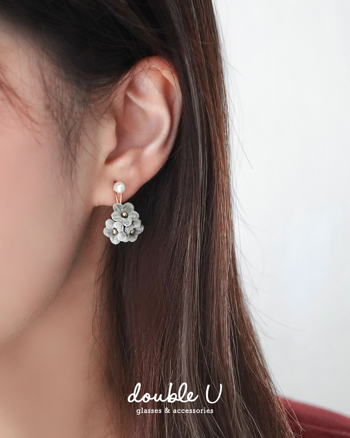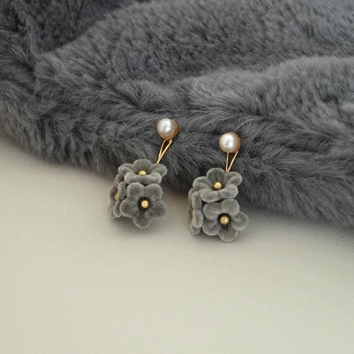 灰絨小花垂墜珍珠耳環・Earring (FEM10432)